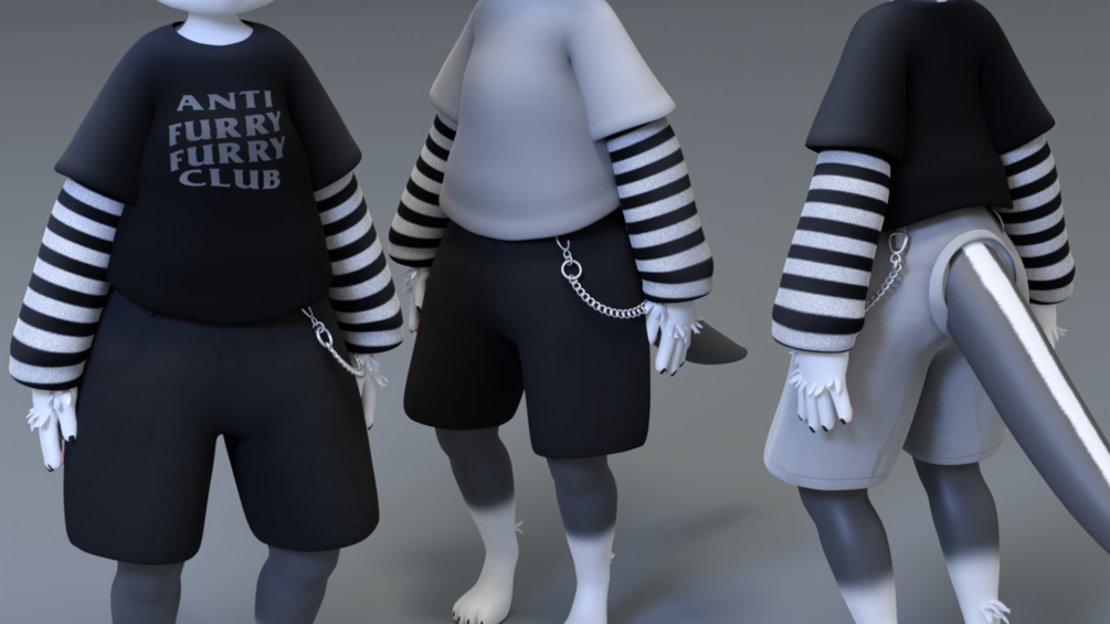 If you have a Nanachi base, you're in luck. The shirt and shorts have custom shapekeys that allow you to quickly fit the dress to any Lexidoll Lexichi, Zoichi, Coppouchi, Rantichi, or other Nanachi base. With a few tweaks, this outfit will also fit a human or other furry avatar.