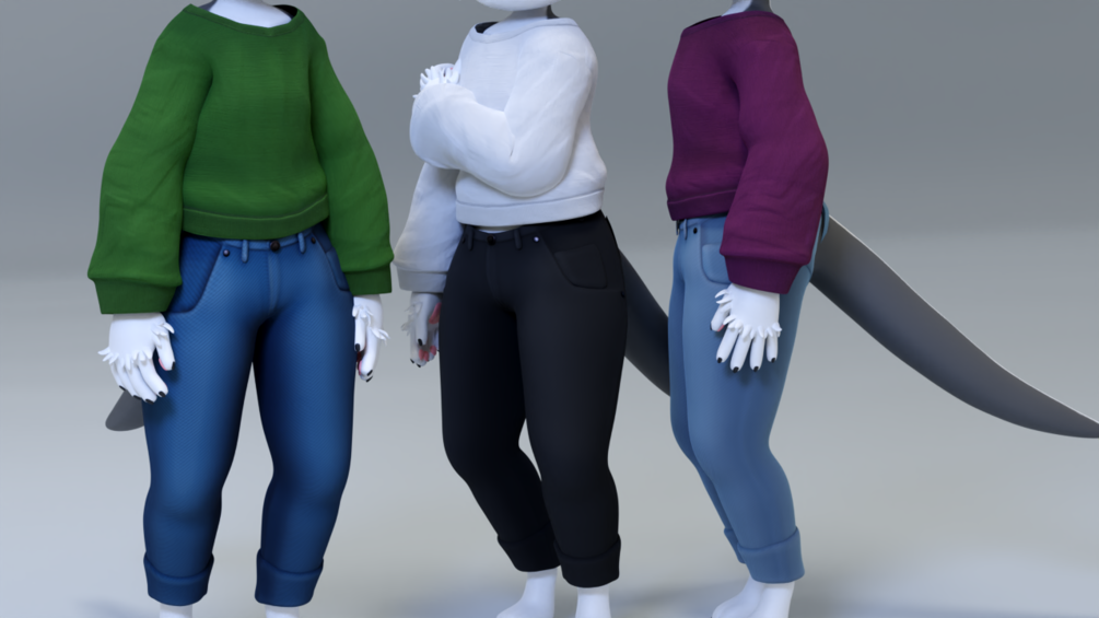 Both the jeans and sweatshirt offer custom shapekeys that allow you to quickly fit the items to any Lexidoll Lexichi, Zoichi, Coppouchi, Rantichi, or other Nanachi base. With a few tweaks, this outfit will also fit a human or other furry avatar.