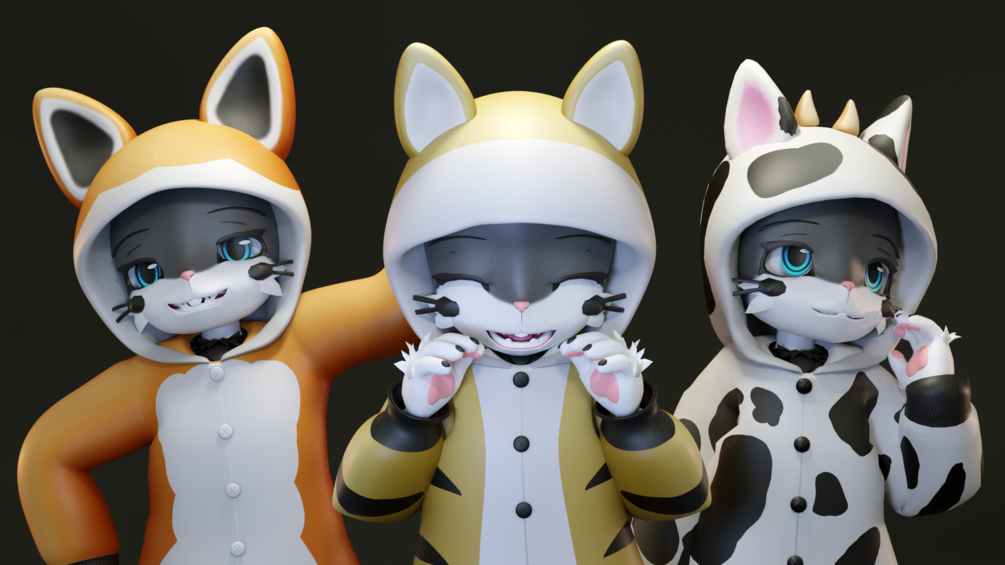 Get cozy with the Cow, Fox, and Cat pajama pack! These kigurumis (onesie pajamas) fit a variety of Nanachis and include tails and ears with PhysBones.